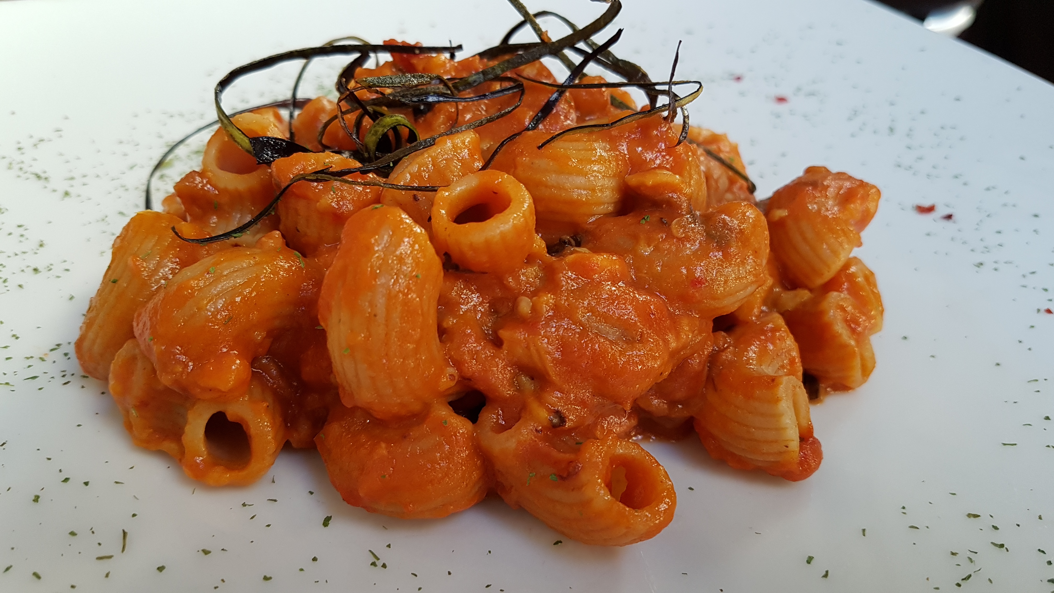 Ci sono state offerte delle zeppoline porri e carota, speciali! Come primo piatto abbiamo scelto uno spaghetto alla “Ciauliello”, impreziosito da pomodorini, peperoncino, olive, pesto di finocchietto selvatico, capperi e spolverata di Gondino Pangea Food: che meraviglia! Una porzione abbonantissima, saporita, che ci ha davvero estasiati per la sua bontà.
